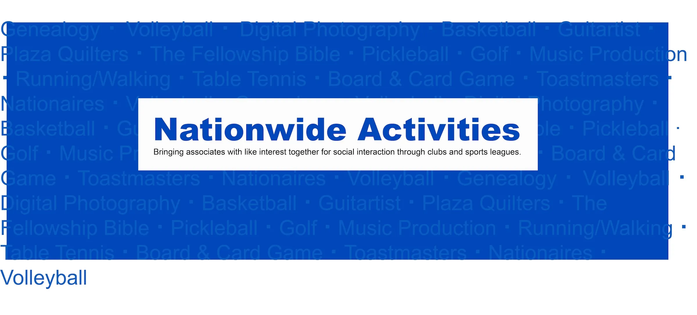 Nationwide Activities was formed to bring associates with like interests together for social interaction through clubs and sports leagues. We are an all-inclusive organization, welcoming all associates to join Nationwide Activities and participate in our member events. Opportunities are available across the country through nationwideactivities.org.